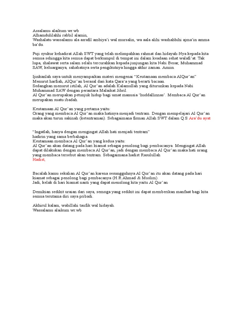 Pidato bahasa inggris ini menjelaskan tentang Quran dan ajaran-ajaran yang terkandung di dalamnya. Beranda Ceramah PIDATO.