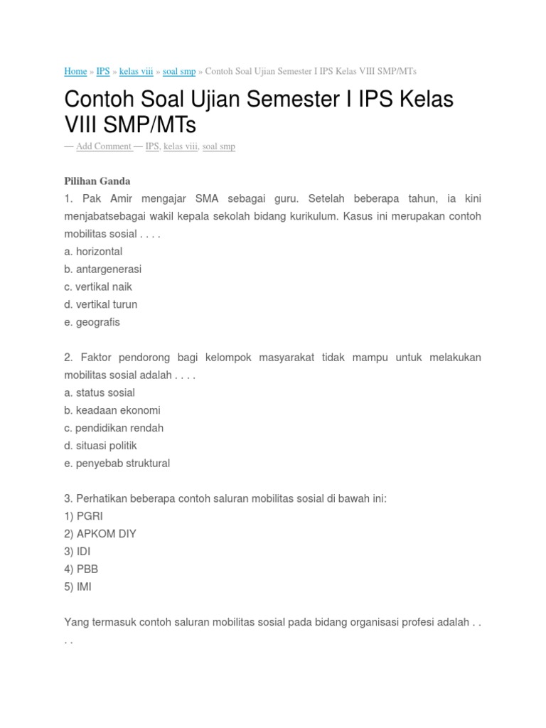 30 Soal Mobilitas Sosial Lengkap Jawaban Latihan Soal Pilihan Ganda Bab Mobilitas Sosial Dalam mobilitas sosial secara vertikal unsur pokok yang ikut bergerak adalah. Contoh soal ips kelas 8 semester 1 mobilitas sosial. Contoh Soal Ujian Semester I IPS Kelas VIII SMP Pilihan Ganda 1.